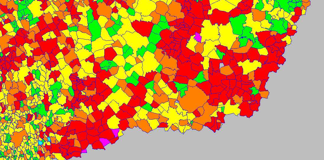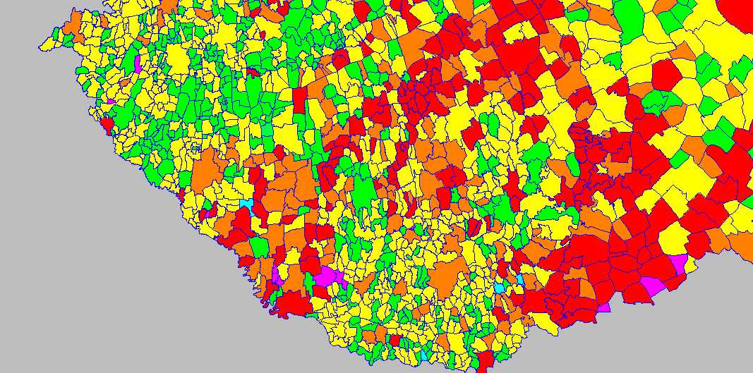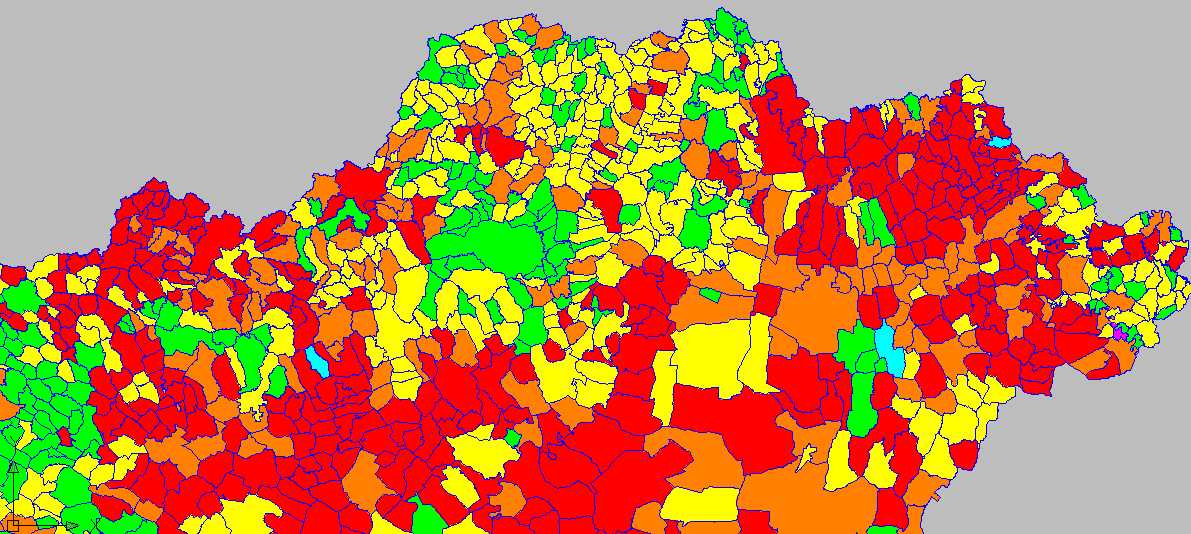 barna - számos út fel van már mérve, általában az utak több mint fele de még jelentős nagyságú területek felméretlenek.